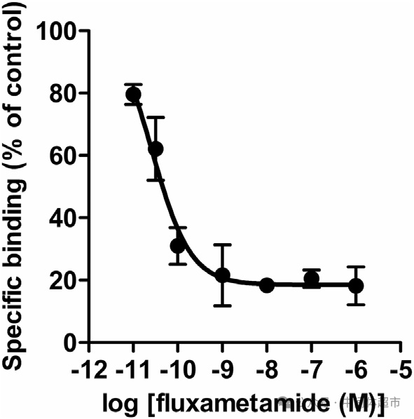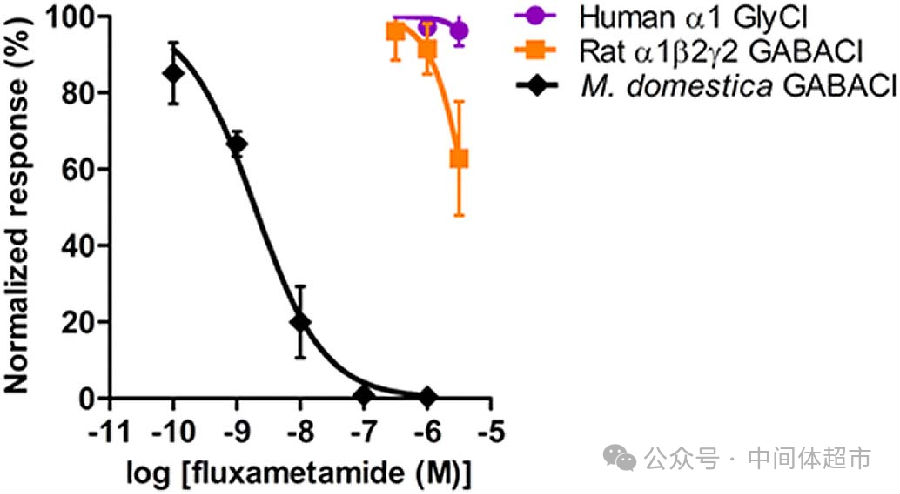 上图显示氟噁唑酰胺抑制[3H]EBOB结合家蝇头膜的浓度曲线。EBOB是已知的、用于标记昆虫神经系统中γ-氨基丁酸(GABA)门控氯离子通道的“探针”。这个结果强烈提示,氟噁唑酰胺的作用可能与这个通道有关。