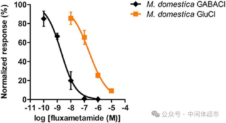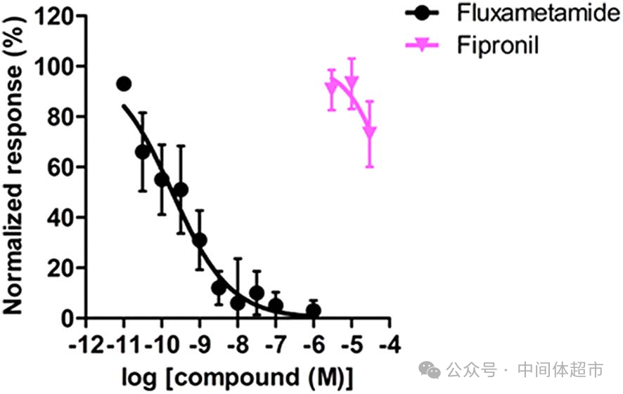 上图显示氟噁唑酰胺抑制家蝇GABA和谷氨酸受体电流的浓度曲线。氟噁唑酰胺确实能以纳摩尔级的高效度,抑制由GABA和谷氨酸激活的电流。这意味着氟噁唑酰胺是一个配体门控氯离子通道(LGCC)的双重拮抗剂,对GABA受体的抑制能力(IC?? = 1.95 nM)比对谷氨酸受体(IC?? = 225 nM)强约115倍,显示了对GABA受体更高的选择性。