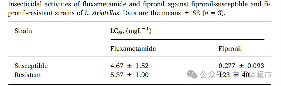 对灰飞虱,氟噁唑酰胺对氟虫腈抗性品系和敏感品系的杀虫效果几乎一样好,而氟虫腈对抗性品系的活性下降了约440倍。