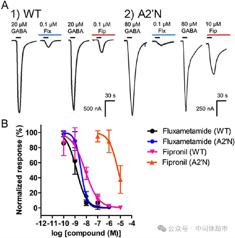 电生理实验证实,氟噁唑酰胺能高效抑制二斑叶螨的野生型GABA受体,而氟虫腈在此几乎无效。