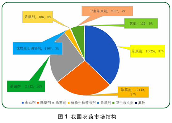 截至2021年12月31日,我国农药登记总数为44701个,有杀虫剂16624个(含杀线虫剂、昆虫性信息素、杀软体动物剂、杀螨剂、杀螺剂),除草剂12149个,杀菌剂11442个,植物生长调节剂1367个,杀鼠剂136个,卫生杀虫剂2857个,其他登记产品126个。其中原药(TC)4527个,母药(TK)250个,制剂39924个。已登记农药的毒性:低毒以下产品38251个,占登记农药总量的86%。我国农药市场结构见图1。