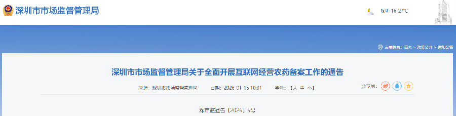 为深入贯彻落实新修订的《农药经营许可管理办法》及《农业农村部办公厅关于印发互联网经营农药专项治理行动方案的通知》(农办农〔2025〕22号,链接网址https://www.gov.cn/zhengce/zhengceku/202512/content_7049983.htm)要求,做好我市互联网经营农药监督管理,现将深圳市全面开展互联网经营农药备案工作的有关事项通告如下: